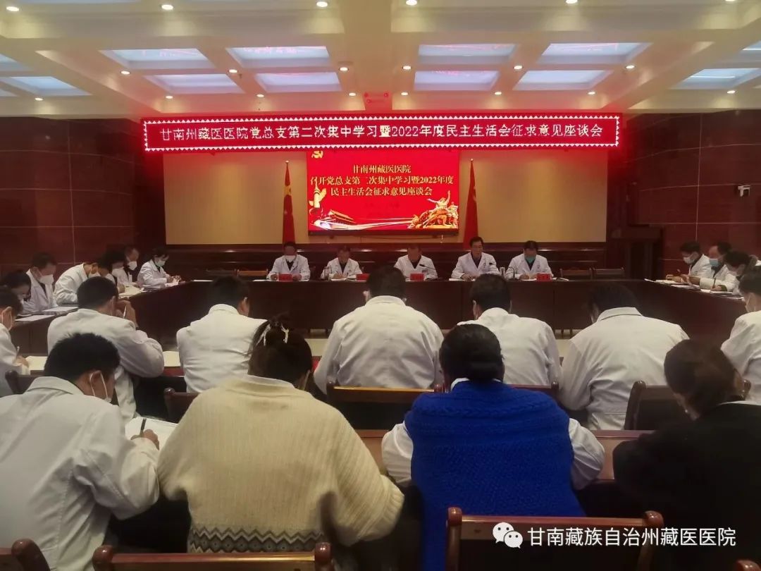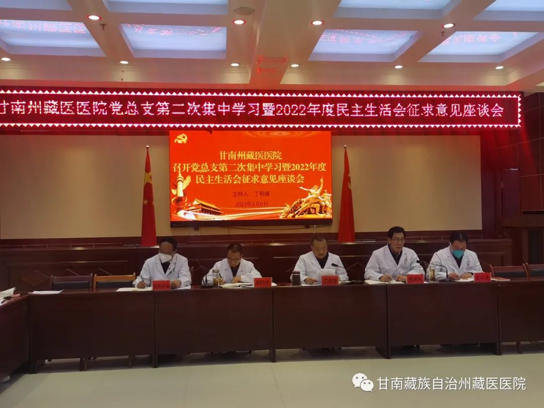 根据中共甘南州纪委机关、州委组织部关于开好2022年度党和国家机关党员领导干部民主生活会的有关要求,甘南州藏医医院党总支班子围绕主题,于2月6日下午组织召开了会前党总支第二次集中学习暨2022年度民主生活会征求意见座谈会,广泛征求对院领导班子和班子成员的意见建议。会议由党总支书记丁利锋主持,院班子成员、全体党员及中层干部参加了会议。