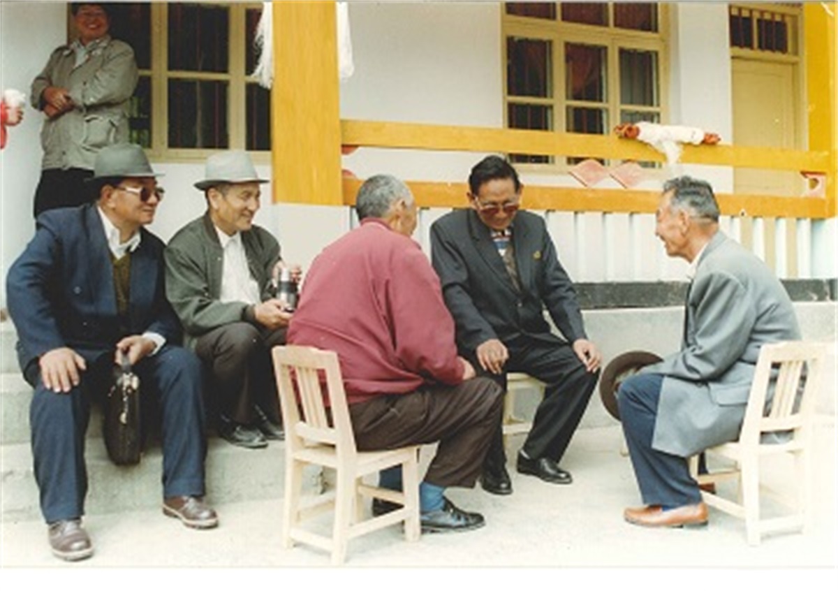 四省区著名藏医药专家强巴赤来、旦科、图布旦、尼玛、加央伦珠在探讨交流