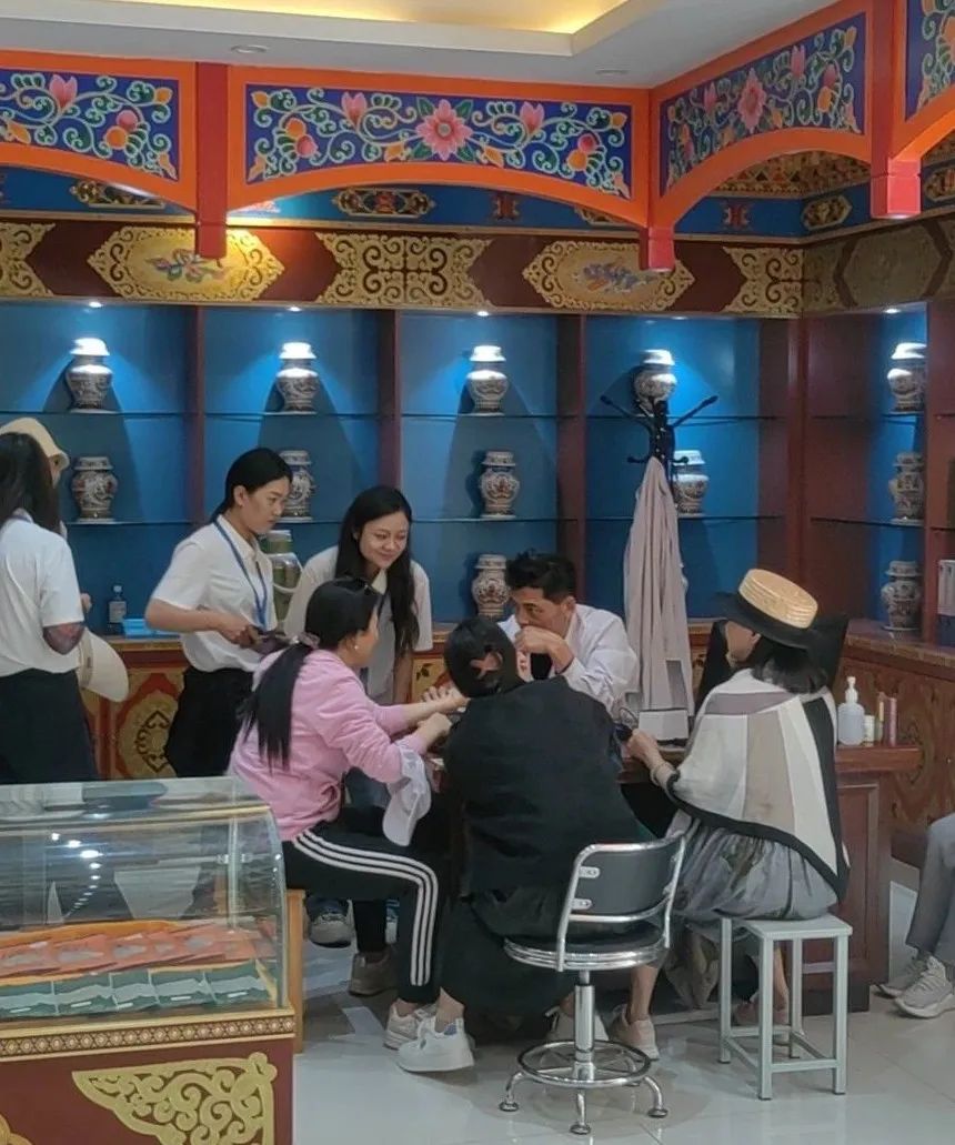 在便民门诊,专家们亲身体验了藏医独特的诊疗方法和治疗手段,根据各自需求开取了藏药制剂。我院藏医专家为考察团成员详细讲解了藏医的五源、三因,寒热学说等基础理论,以及金针、铁烙、放血、药浴等特色疗法。专家们纷纷表示,这些疗法不仅具有显著的治疗效果,还蕴含着深厚的文化内涵,是藏医药与文旅融合发展的宝贵资源。