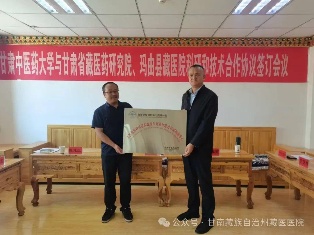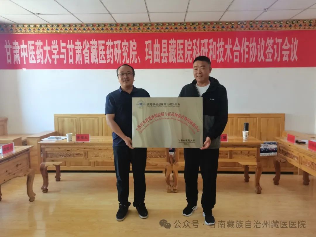 王强表示希望通过“天然药用种质资源挖掘与新品种选育协同创新中心”这个平台进一步加强合作、相互交流,共同努力让合作签约项目落地,解决两家医院迫切需要解决的难题,真正实现产、教、研有机结合,实现校地合作,为区域社会的发展做一些贡献。甘肃中医药大学与甘南州藏医医院签订科研和技术合作协议甘肃中医药大学与玛曲县藏医院签订科研和技术合作协议甘肃中医药大学授予甘南州藏医医院“天然药用种质资源挖掘与新品种选育协同创新中心”牌匾甘肃中医药大学授予玛曲县藏医院“天然药用种质资源挖掘与新品种选育协同创新中心”牌匾 此次合作,甘肃中医药大学与甘南州藏医医院及玛曲县藏医院将围绕“天然药用种质资源挖掘与新品种选育协同创新中心”的系列合作与活动展开深入交流,共同探索天然药用资源的宝贵价值,为推动我州乃至全省中藏医药事业的繁荣与发展注入新的强劲动力。