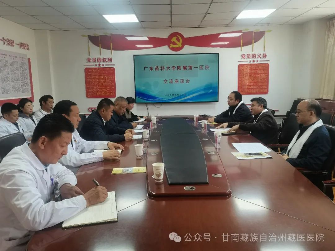 4月14日,广东药科大学第一附属医院党委书记林伟成,院长林强,医联体办公室主任向海卿一行来我院开展交流座谈。双方围绕藏医药文化推广、特色诊疗、藏药制剂、学科建设、人才培养等议题深入探讨,以“共商共建共享”为目标,推动藏医药瑰宝走出甘肃、走向全国惠及更多百姓。州计划生育协会副会长、秘书长李峰琦,我院副院长尕旦木加、尕藏加措、李德红及相关科室负责人陪同。