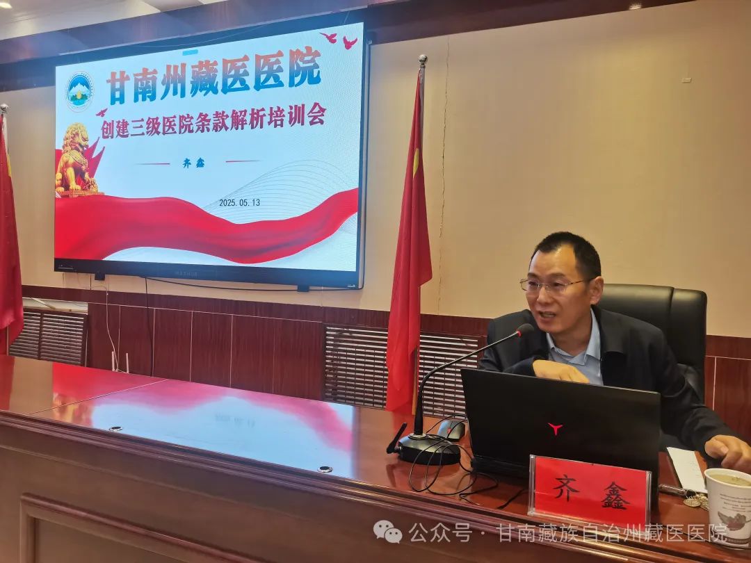会议宣读了《创建三级民族医院实施方案》,明确了组织机构、工作目标、工作内容、实施步骤和任务要求。领导小组办公室代表作表态发言,积极响应医院的号召。 州卫健委党组书记、主任马彪顺在讲话中深刻阐述了创建三级民族医医院的重要意义,从我州藏医药高质量发展的战略高度,对创建工作进行了部署要求。指出,甘南州藏医医院创建三级民族医医院,对于传承和弘扬藏医药文化、强化学科建设、科学研究、人才队伍建设,提升医院管理水平、医疗质量和服务水平、社会效益、促进医院可持续发展具有重要意义。创建工作是一项系统工程,需要全院职工凝心聚力、共同努力。各科室要对照创建标准,认真梳理工作任务,明确职责分工,制定详细的工作计划和时间表,确保各项工作有序推进。在创建过程中,要以评促建、以评促改、以评促管,全面加强医院内涵建设,提升医疗质量和服务水平,加强人才队伍建设和学科建设,强化医院管理和文化建设,不断完善医院的服务功能和运行机制。同时,要充分调动全体职工的积极性和主动性,形成人人参与创建、人人支持创建的良好氛围。 副院长尕旦木加在动员讲话中指出,创建三级医院是医院发展史上新的里程碑,是引领医院走向规范化、标准化、科学化管理的新航标。一是强化组织领导,成立专项工作组,实行“一把手”负责制,细化任务清单,明确时间节点,确保各项工作有序开展。二是严格对标对表,各科室要深入学习评审细则,全面梳理自身存在的问题,补短板、强弱项,确保每一项指标都能达标达优。三是弘扬奉献精神,全体职工要以“功成不必在我,功成必定有我”的担当,将创建工作与日常诊疗紧密结合,展现藏医药人的专业精神和热忱态度,确保三级医院创建工作取得圆满成功。 会议特邀国内知名医院等级评审辅导专家、中国民族卫生协会特聘专家、甘南州卫健委特聘医院等级评审咨询顾问齐鑫同志作了《创建三级医院条款解析》专题培训。 此次启动会的召开,标志着甘南州藏医医院创建三级民族医医院工作正式拉开帷幕。我院将以创建三级民族医医院为契机,传承精华、守正创新,为藏医药事业的繁荣发展贡献更大力量!