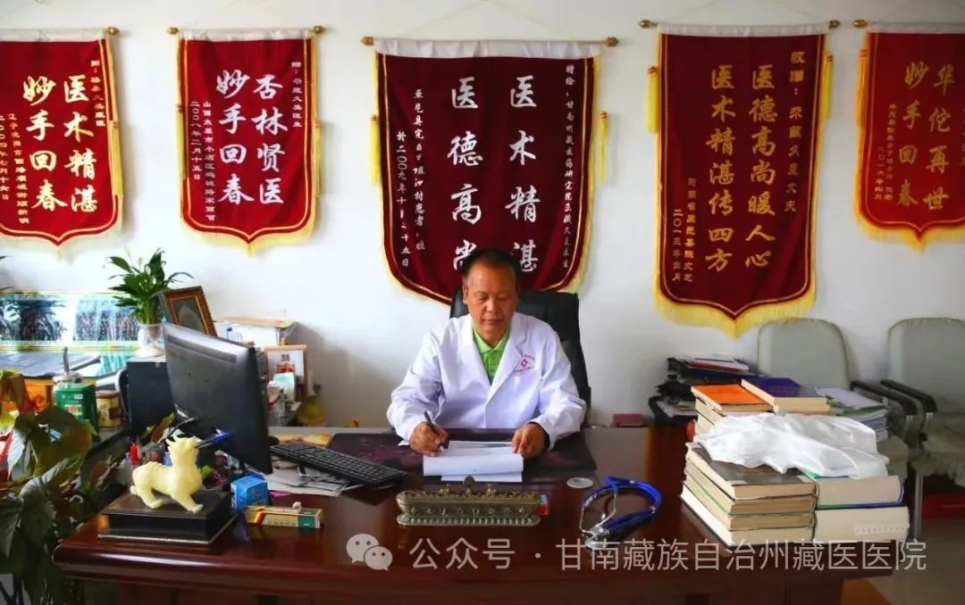 从医35年来,他始终立足岗位、甘于平凡、勤勤恳恳、任劳任怨,满腔热情地为广大患者排忧解难,以实际行动践行“医者仁心”的责任担当。严格要求,精益求精,辨证施治,以精湛的技术诊疗病人,以优质的服务对待病人,他用一点一滴的实际行动赢得了群众肯定和信任,每天慕名求医者络绎不绝,他的诊室墙上挂满了患者送的锦旗和哈达。作为一名藏医,他始终不忘藏医人“济世利众”的初心,在几十年的医疗实践中,他怀着一颗炙热的爱心和对藏医药事业的热爱,坚持每年为特困农牧民群众开展免费送医送药义诊活动,献爱心垫付医药费累计达80余次。传承弘扬藏医药文化及特色优势是他的毕生追求,他非常注重培养藏医药人才,承担年轻医生的传、帮、带任务,将自己的诊疗经验毫无保留地传授给他们,先后培养各地见习生、实习生、进修生200多名,为藏医人才培养和临床教学发挥了积极作用,有效推动藏医药事业进一步普及,成为医院全科大夫的榜样和学科带头人,他是学生眼里的“好老师”,患者心中的“好曼巴”!