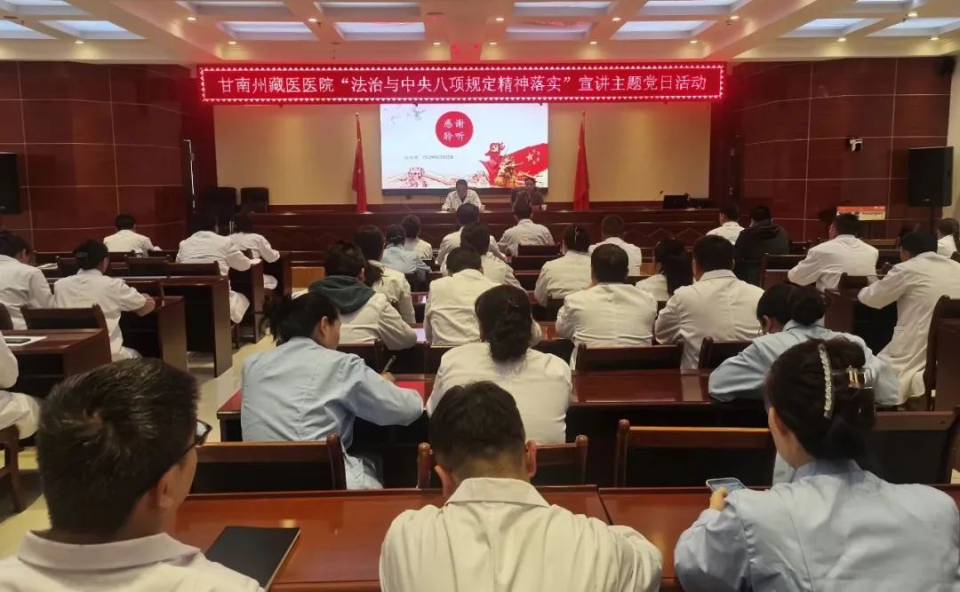 为深入贯彻党的二十届三中全会精神,巩固拓展学习贯彻习近平新时代中国特色社会主义思想主题教育成果,落实党中央关于在全党开展深入贯彻中央八项规定精神学习教育的部署,全面宣传贯彻习近平法治思想,推动落实“八五”普法规划,进一步提升全院党员干部的法治意识和纪律意识,6月18日下午,甘南州藏医医院开展法治宣传与中央八项规定精神落实宣讲主题党日活动。