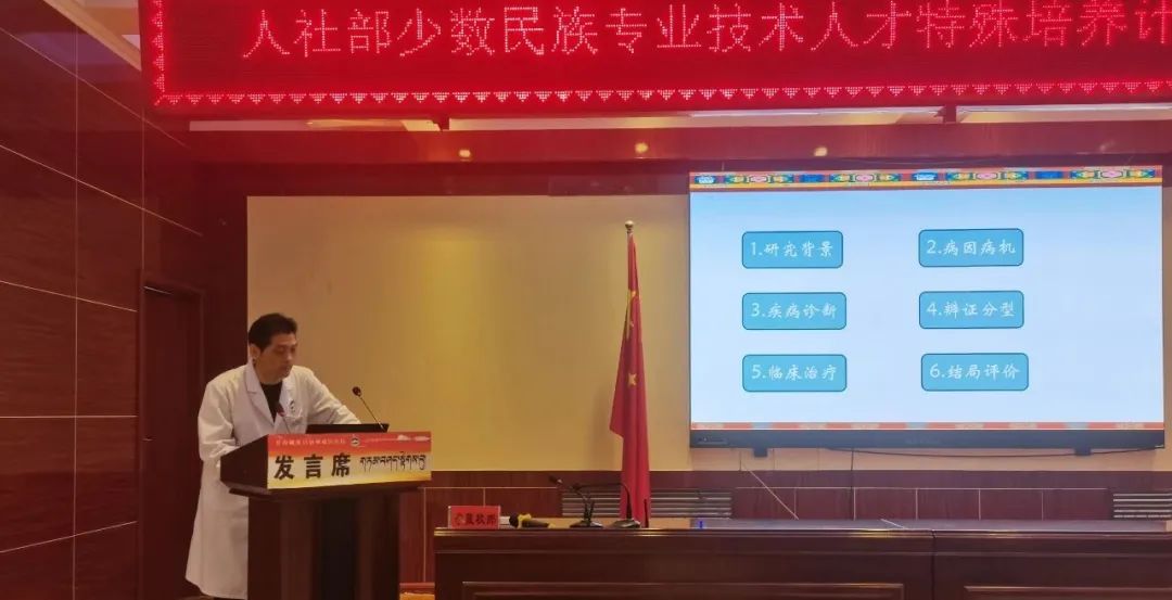 我院副院长、藏医副主任医师尕藏校郎以“藏药二十五味余甘子丸对高原红细胞增多症临床疗效研究”为题,汇报了医院在藏药治疗高原病领域的研究成果,展现了藏医药在特色疾病防治中的独特优势。