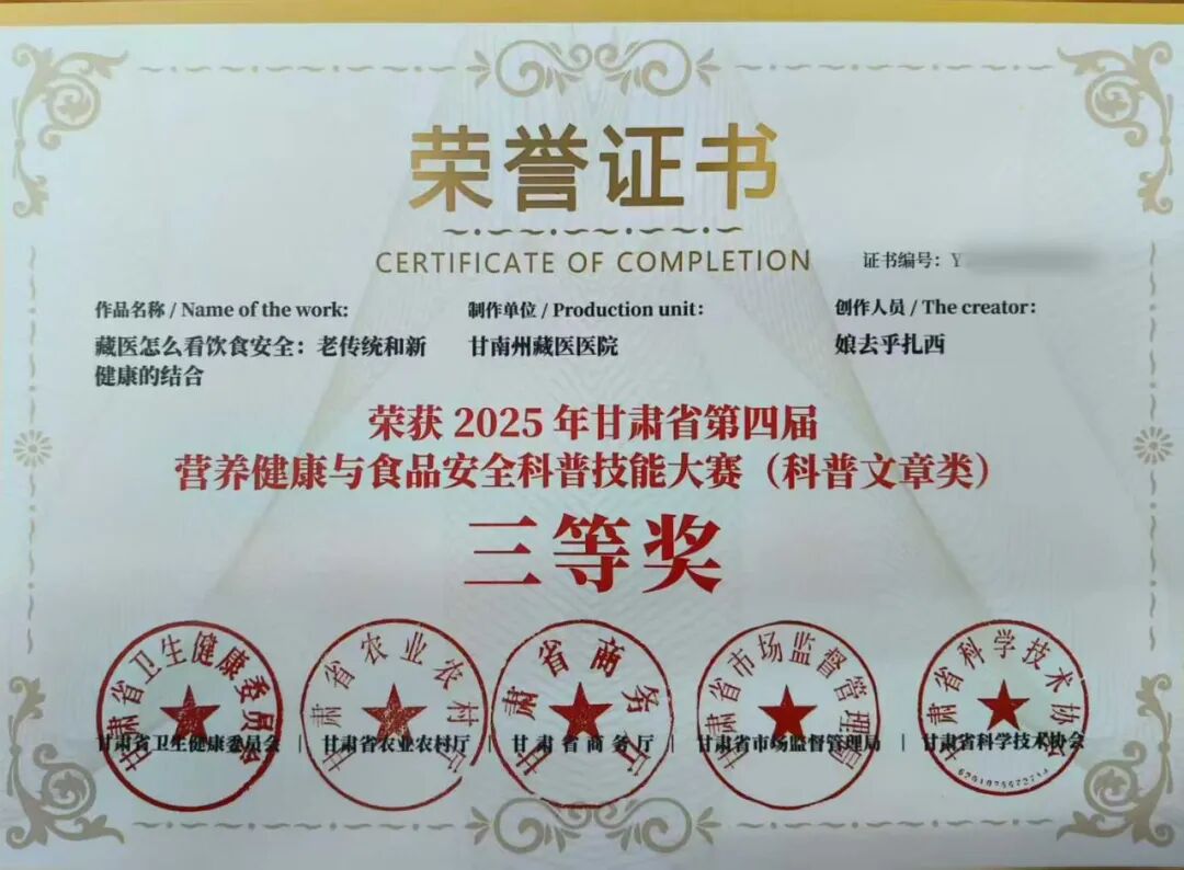 甘南州藏医医院藏副主任医师娘去乎扎西在2025年甘肃省第四届营养健康与食品安全科普技能大赛中收获佳绩,其撰写的《藏医怎么看饮食安全:老传统和新健康的结合》一文,凭借对藏医养生智慧的专业解读,荣获比赛三等奖。今天特别提炼分享出来,带大家一起从老传统里挖“新健康”,用藏医智慧守护日常饮食安全!