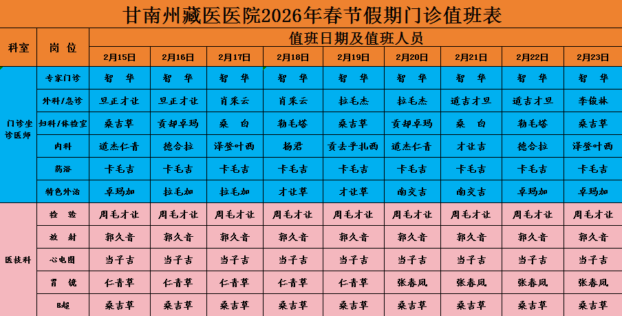 甘南州藏医医院2月15日—2月23日春节假期门诊排班表