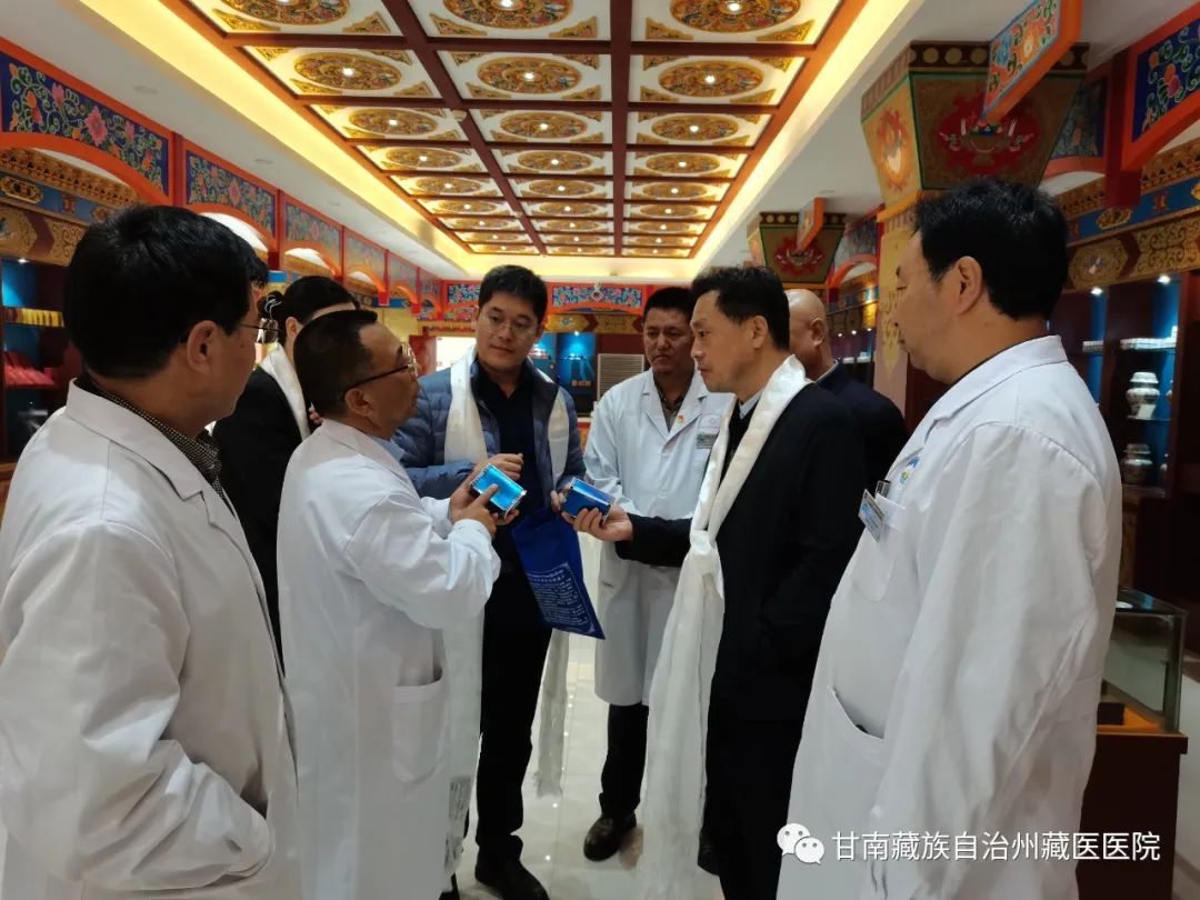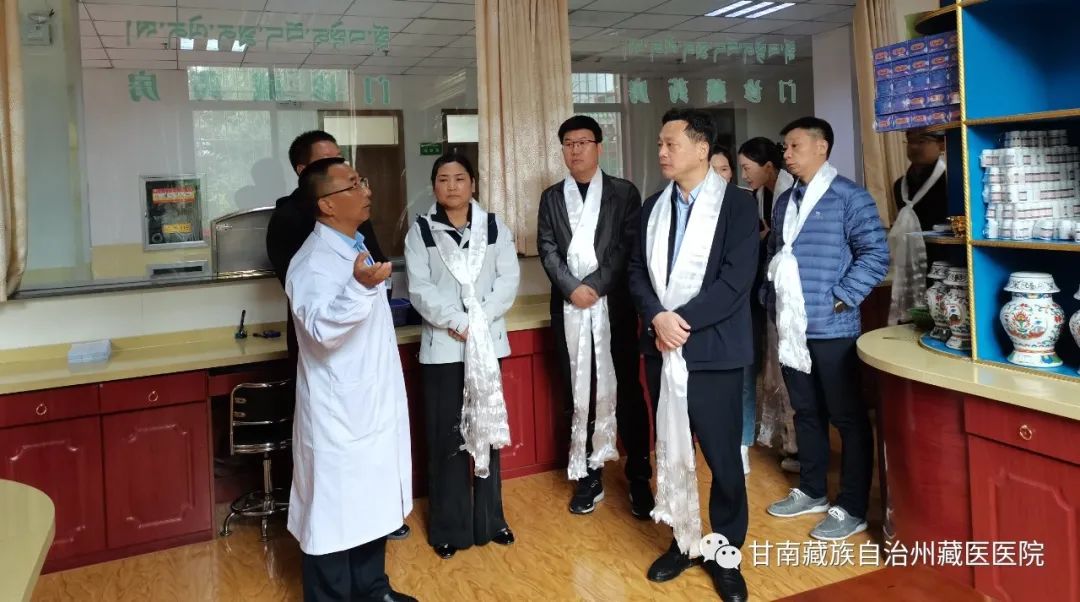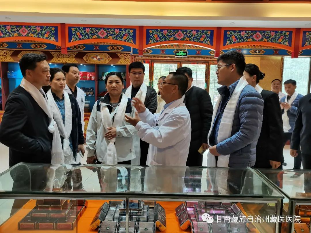 考察组一行实地查看了医院藏药房、藏医药文化展示馆、便民门诊,院长道吉仁青详细介绍了我院医疗、科研、制剂生产、文化传播等方面的情况。